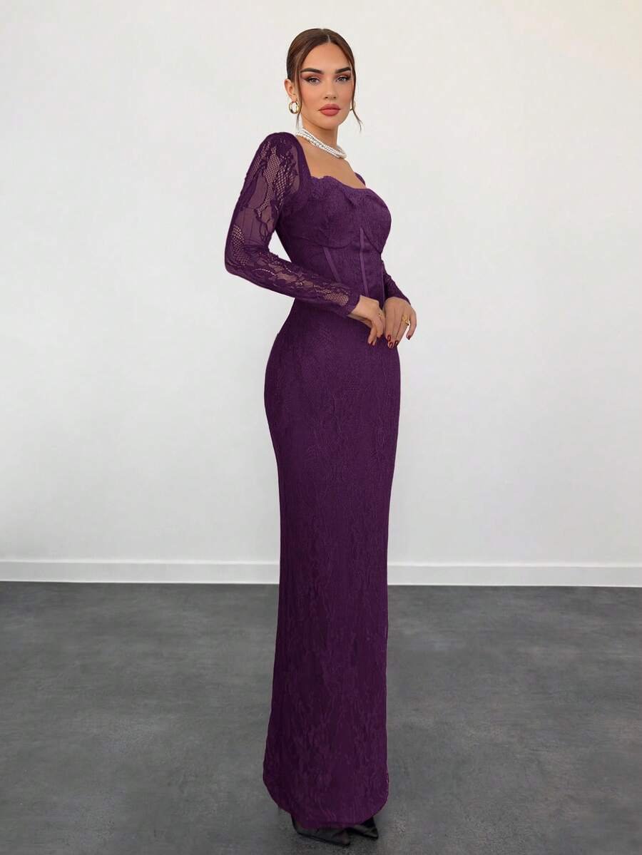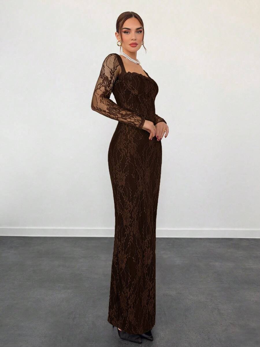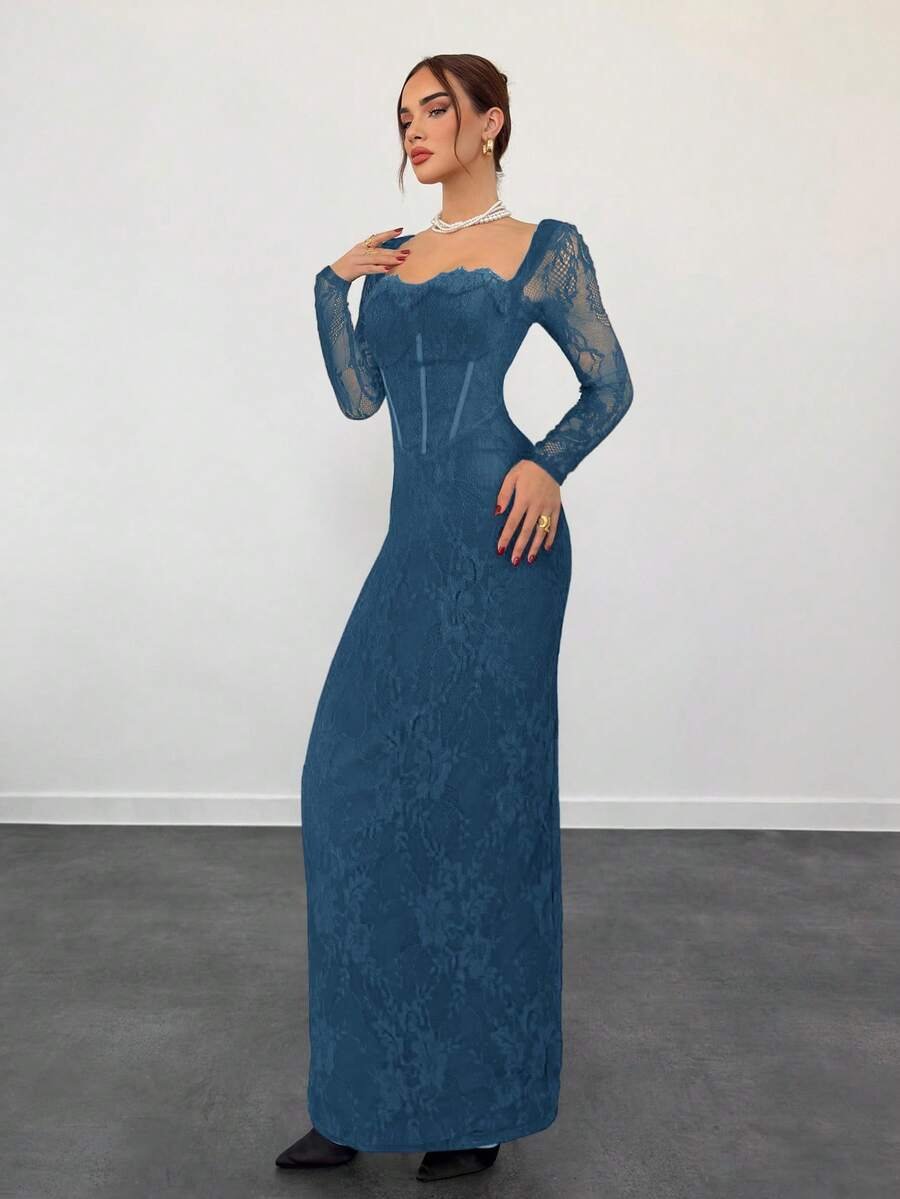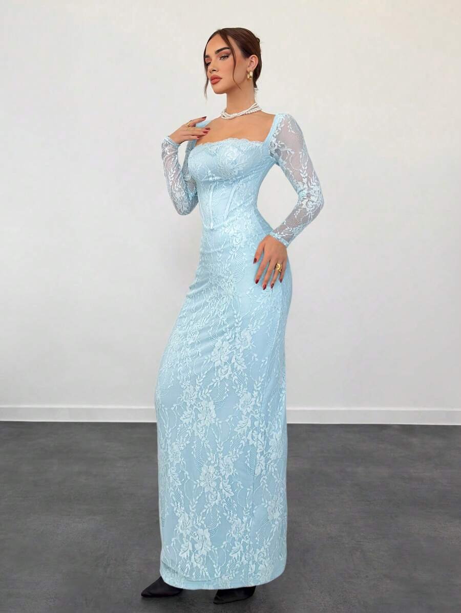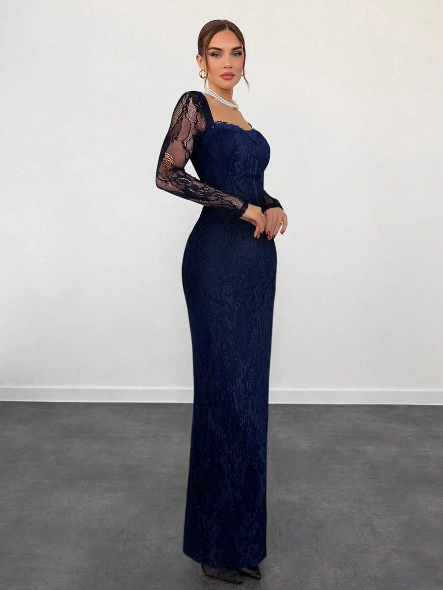 فستان سهرة طويل دانتيل بأكمام طويلة ورقبة مربعة