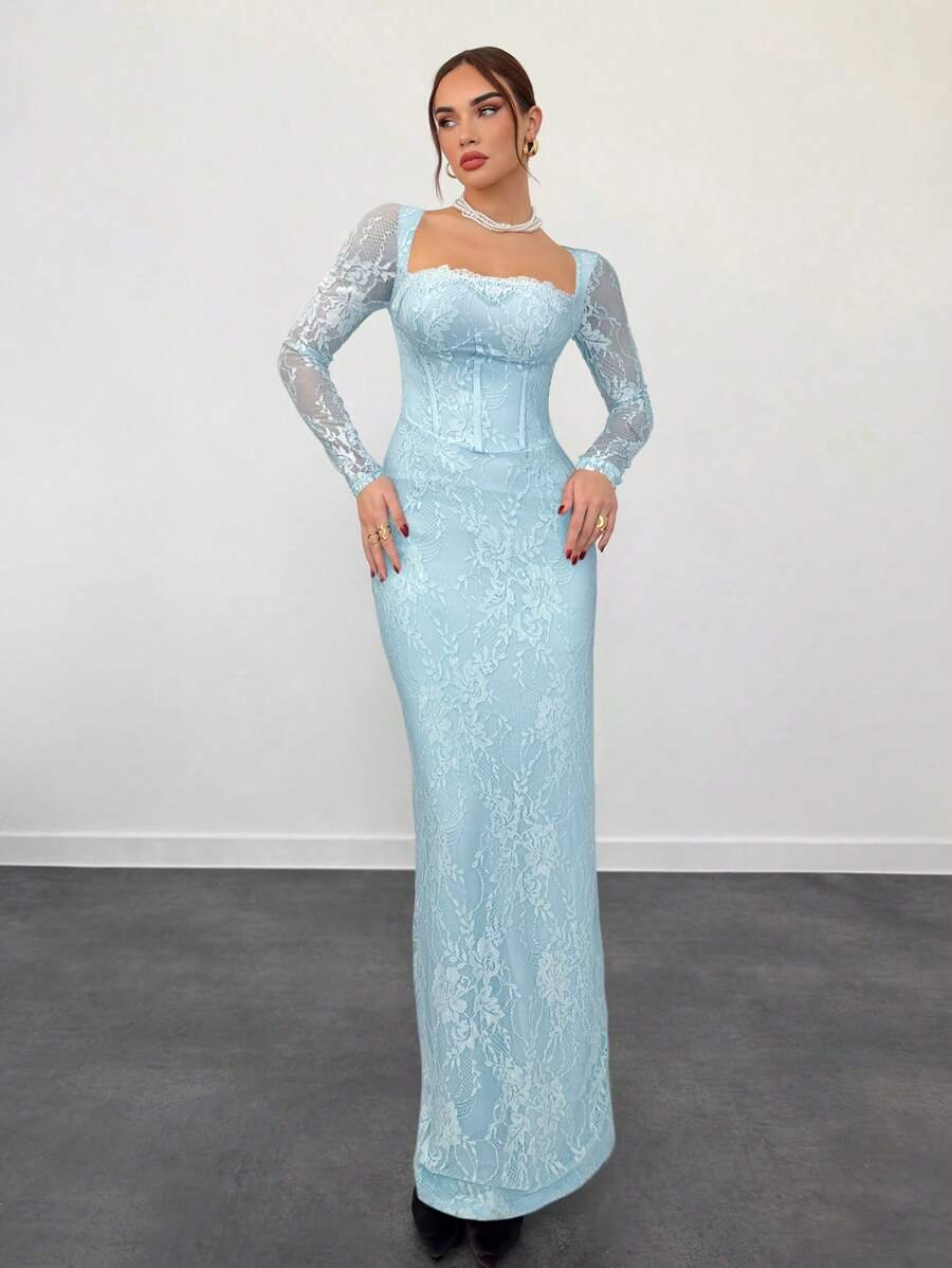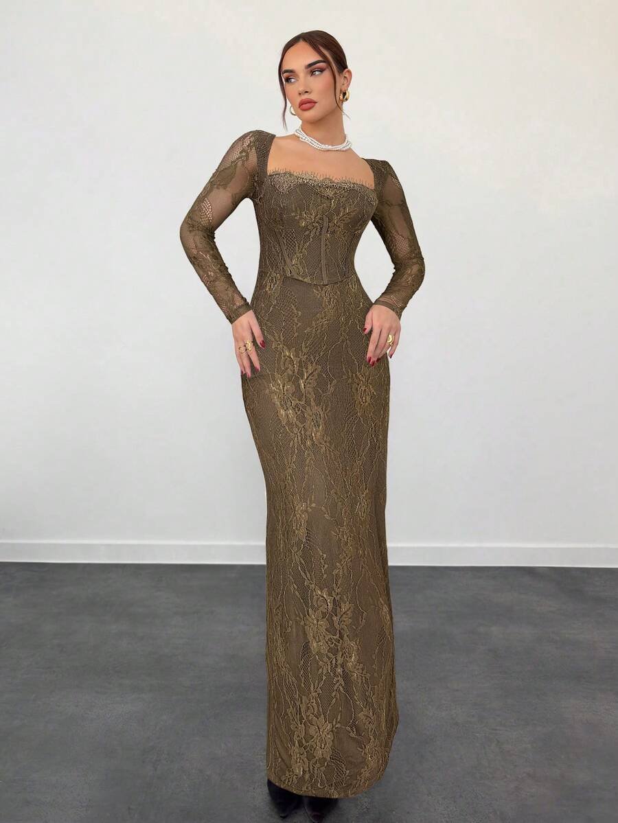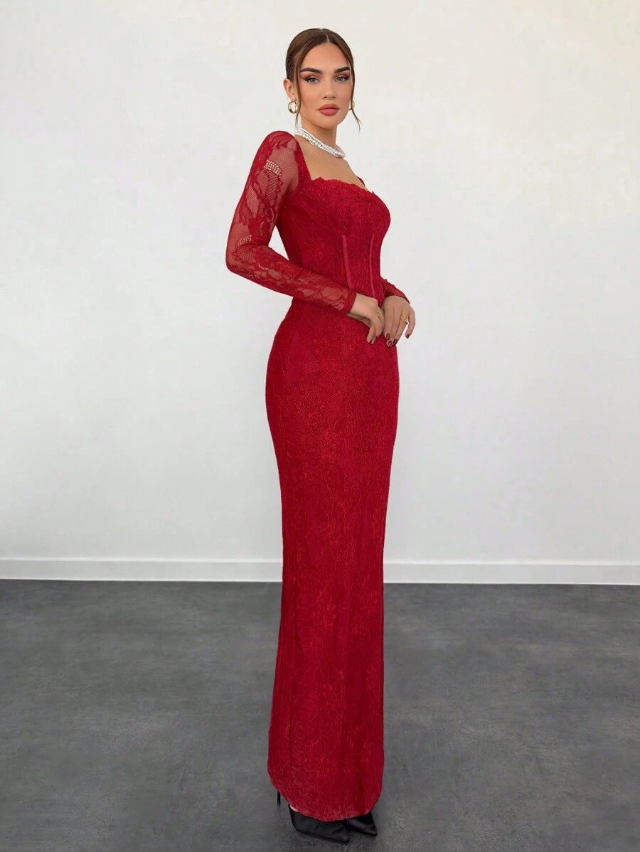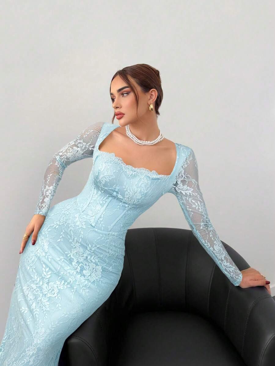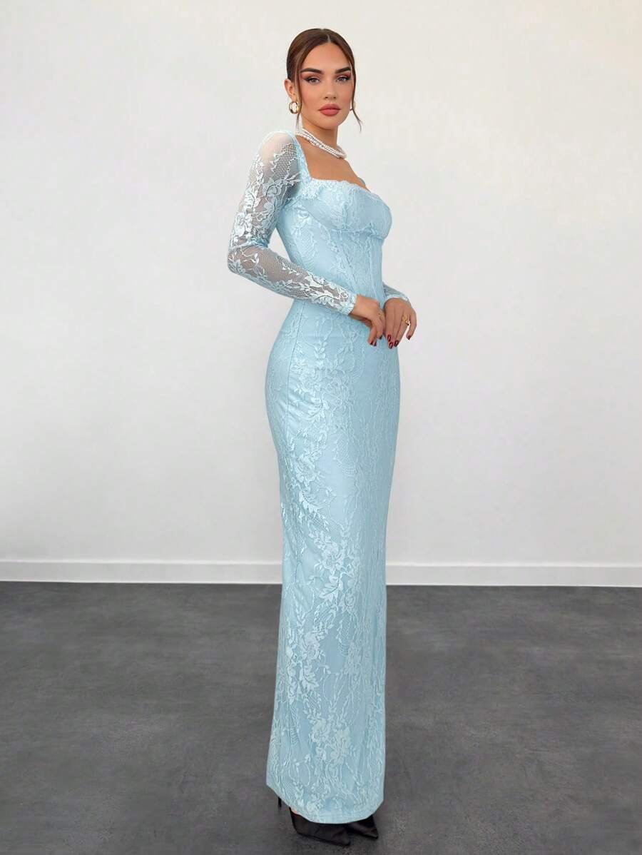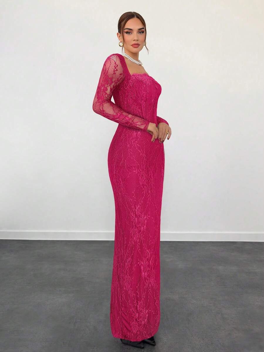 فستان سهرة طويل دانتيل بأكمام طويلة ورقبة مربعة