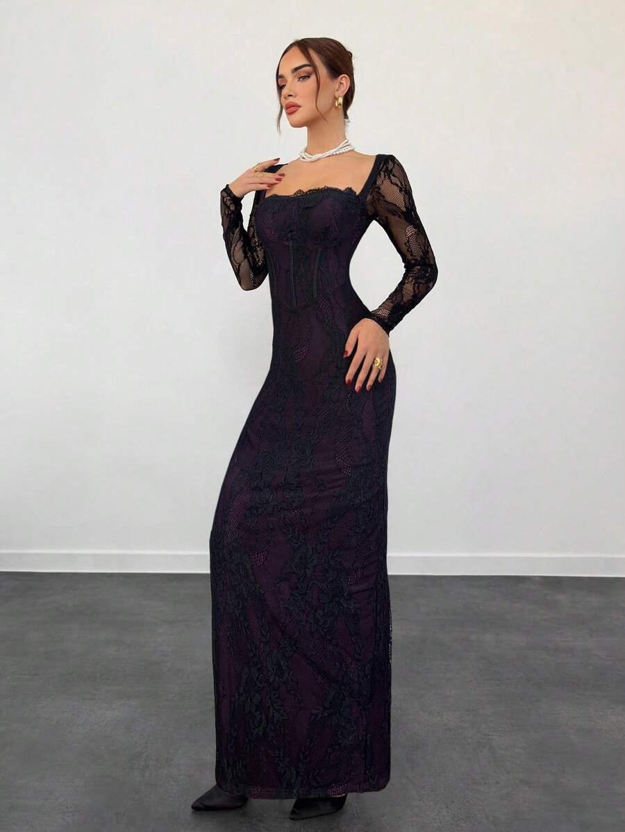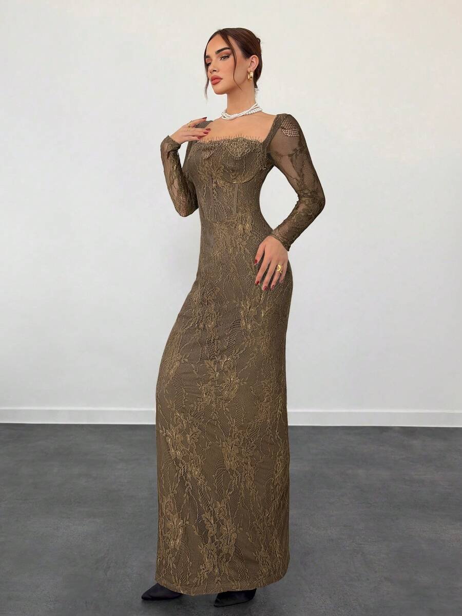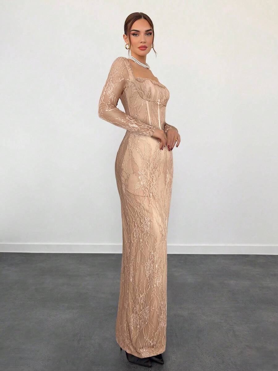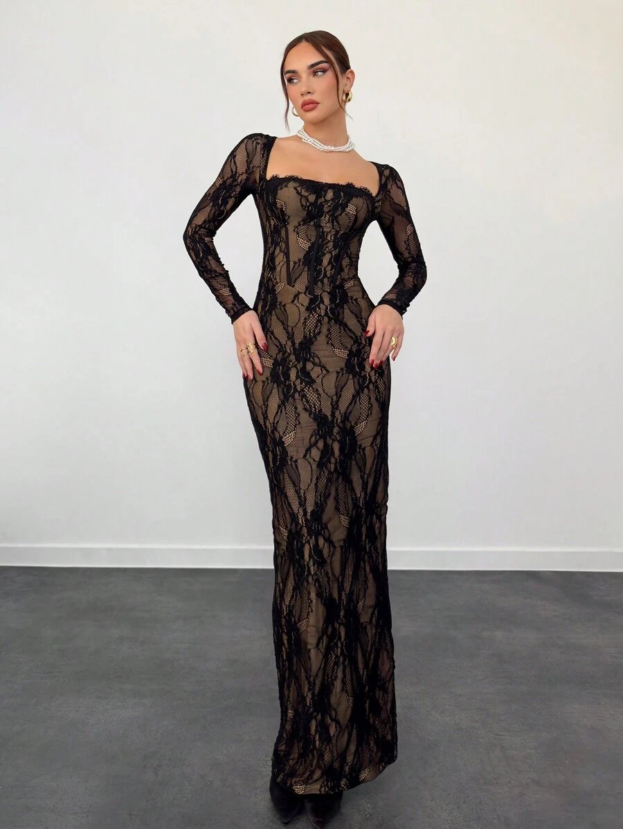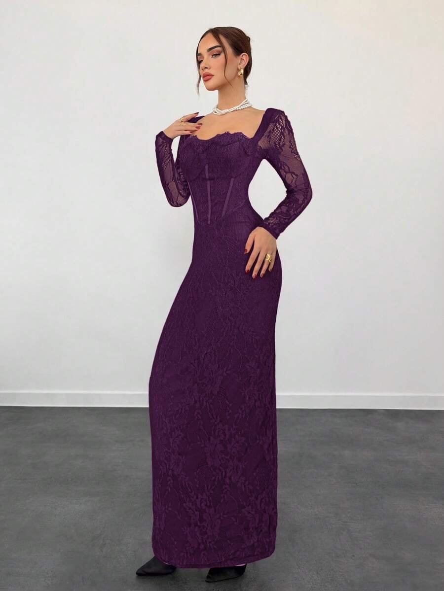 فستان سهرة طويل دانتيل بأكمام طويلة ورقبة مربعة