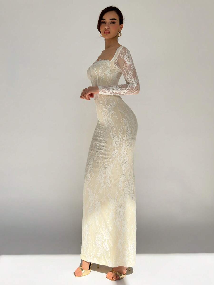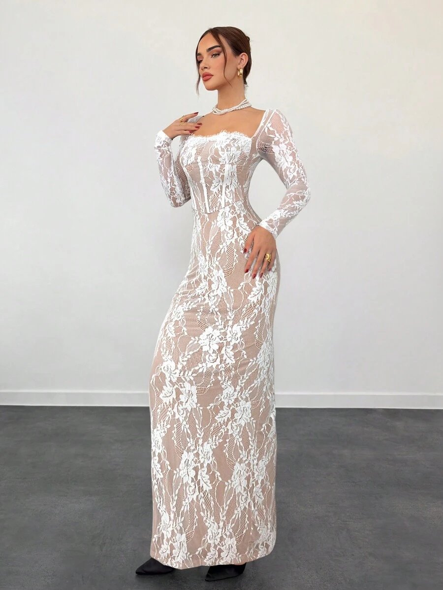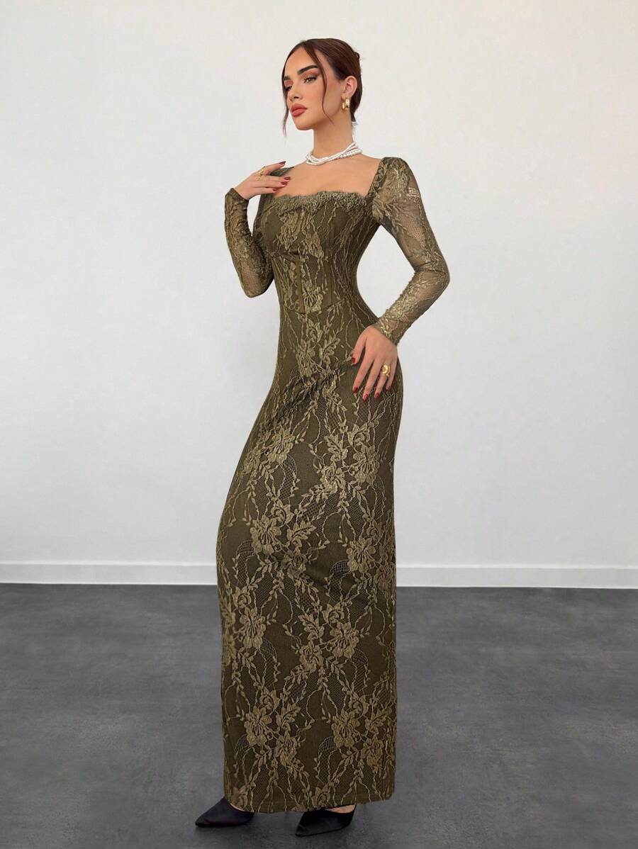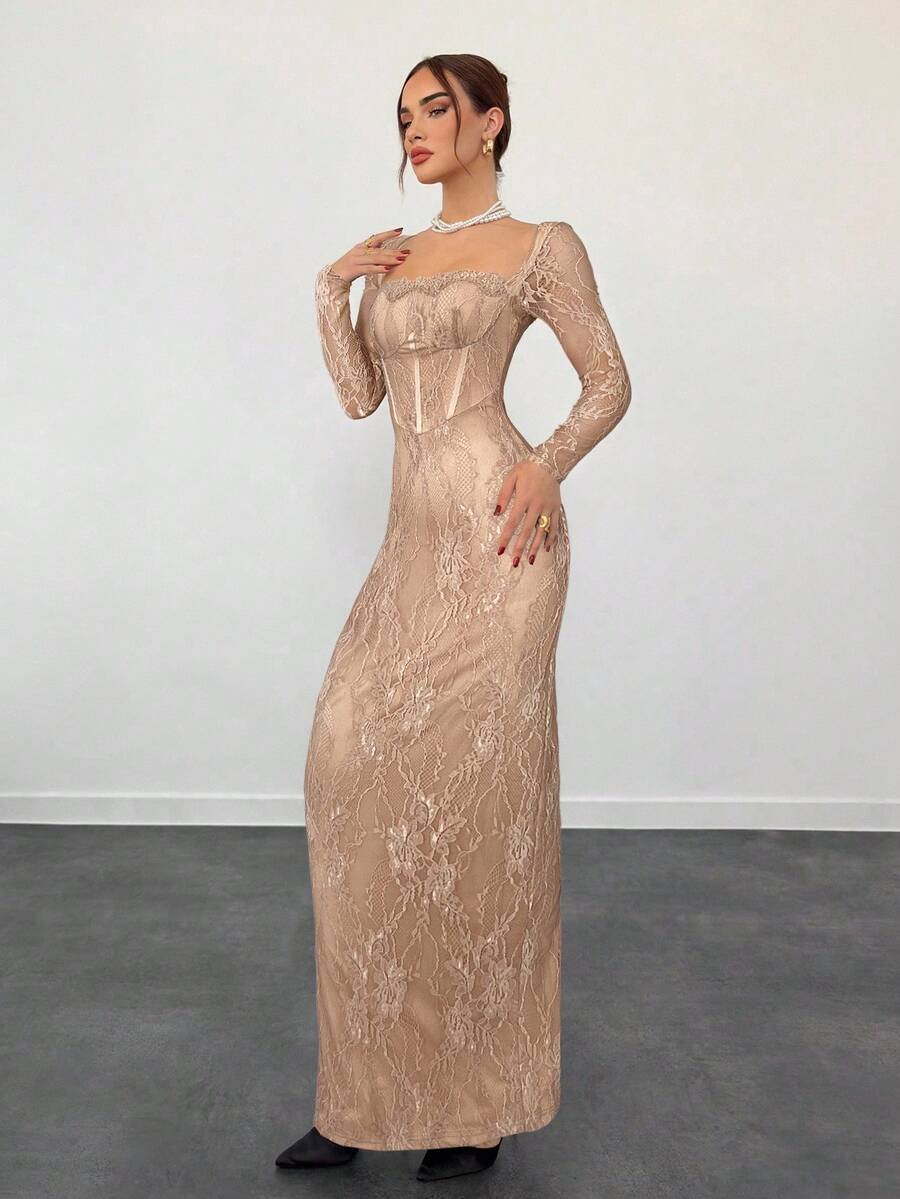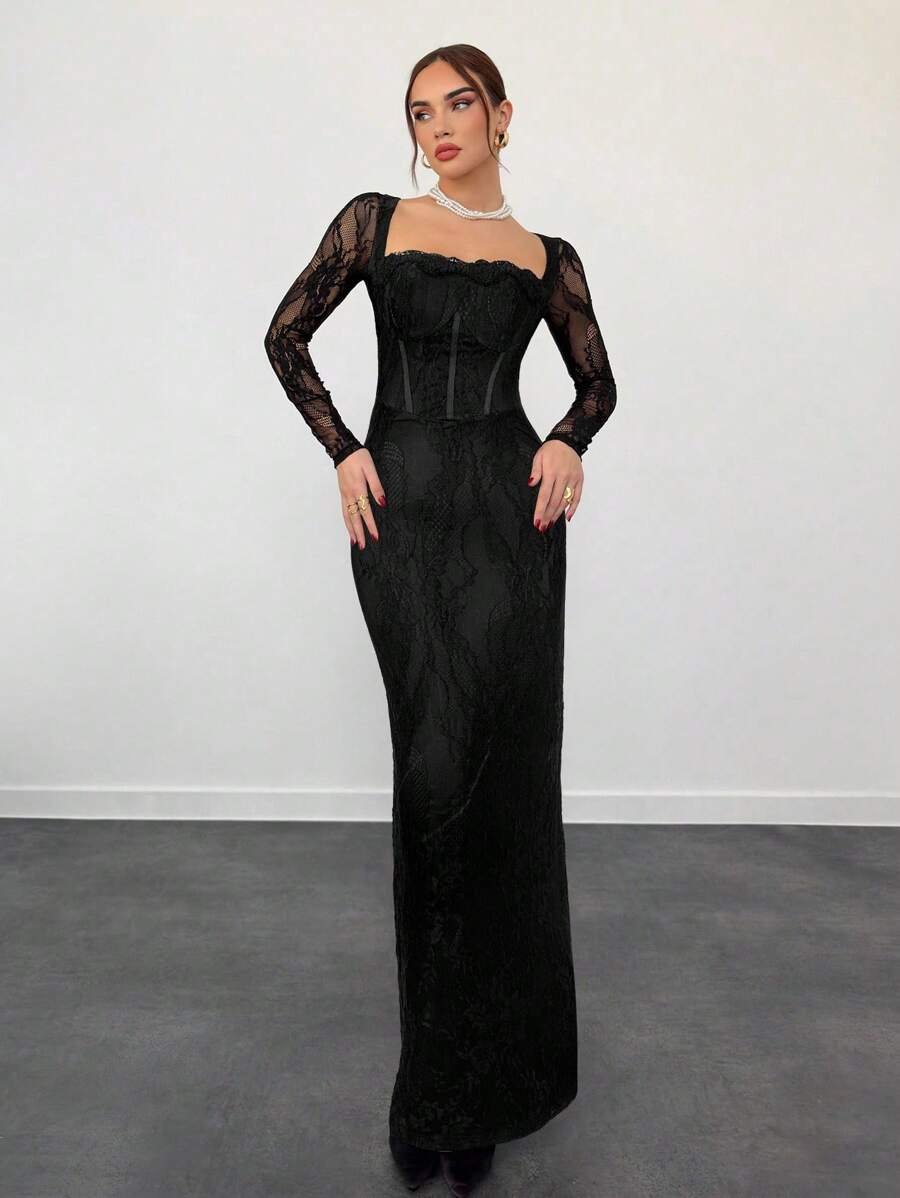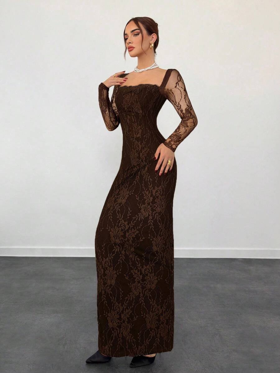فستان سهرة طويل دانتيل بأكمام طويلة ورقبة مربعة