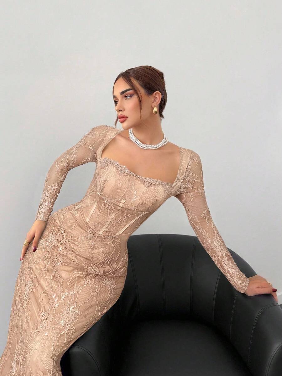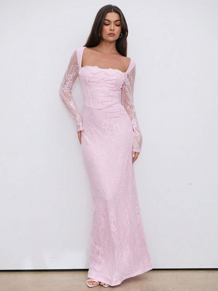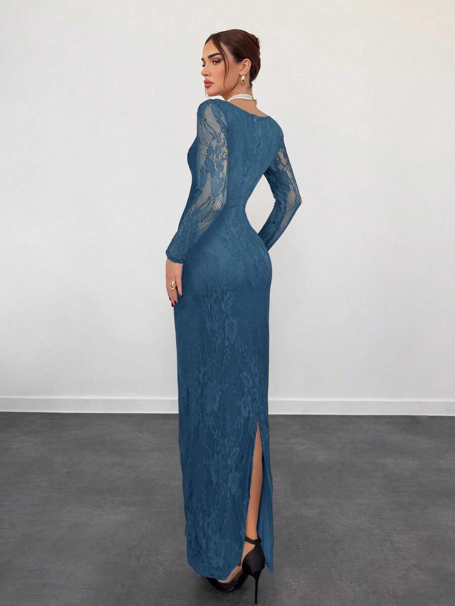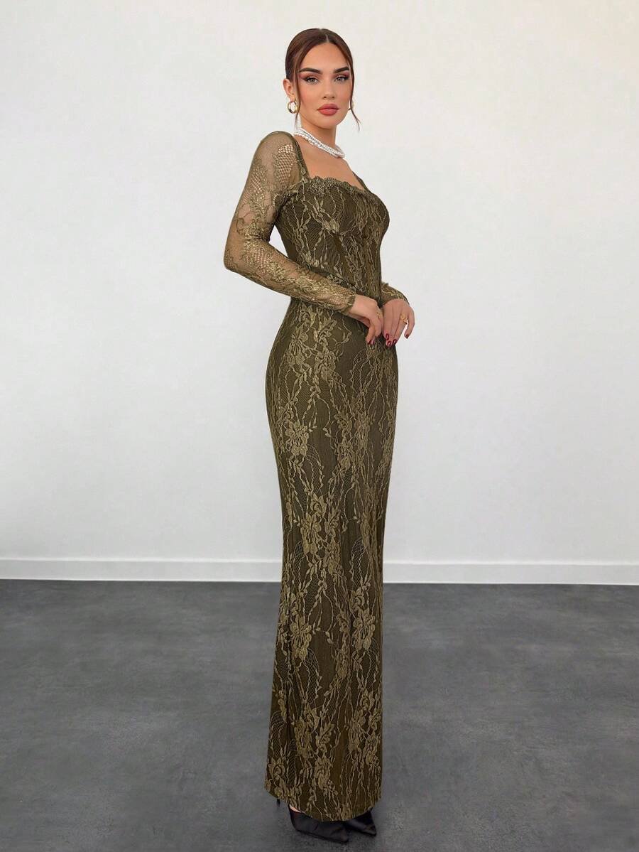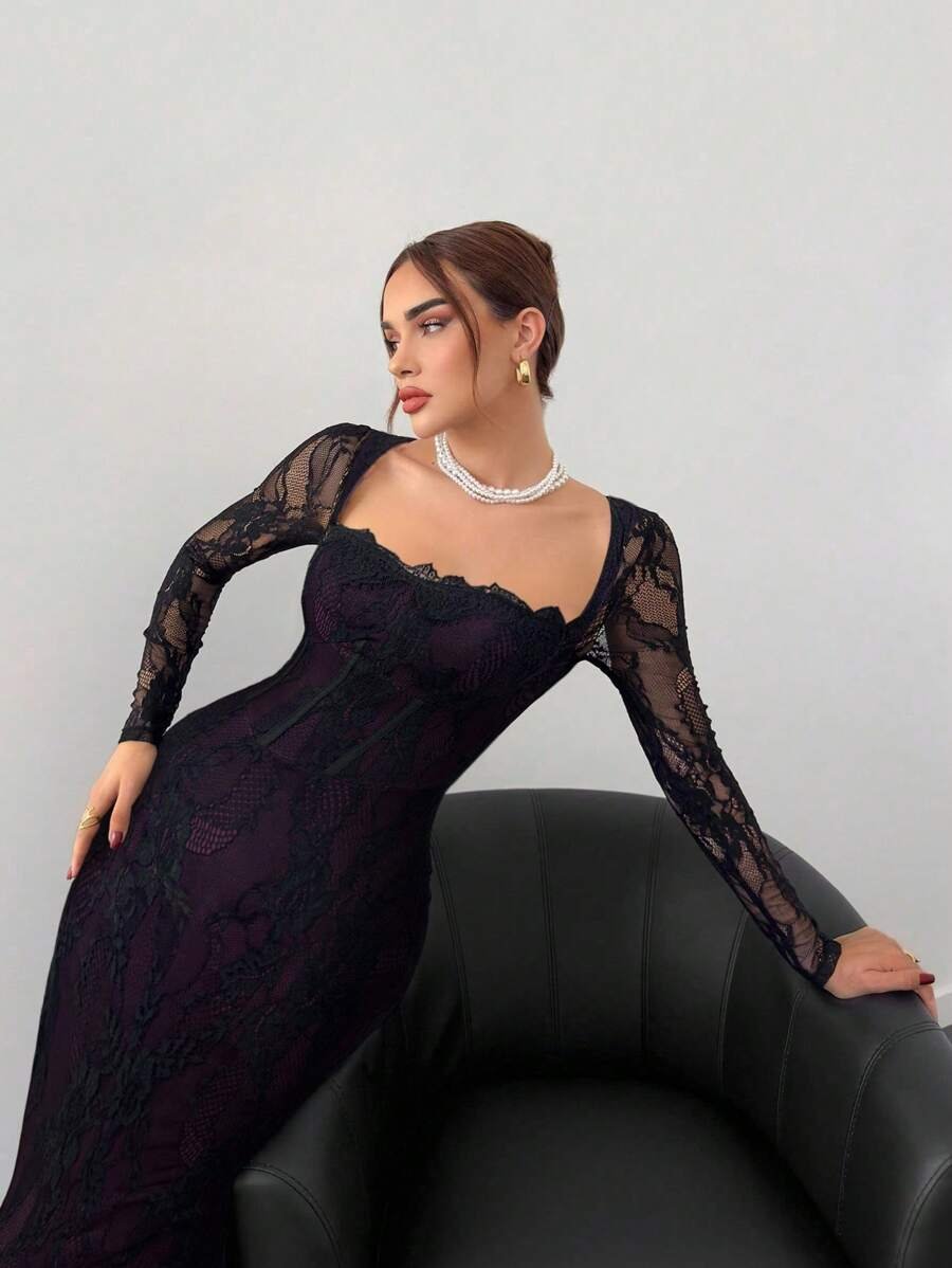فستان سهرة طويل دانتيل بأكمام طويلة ورقبة مربعة