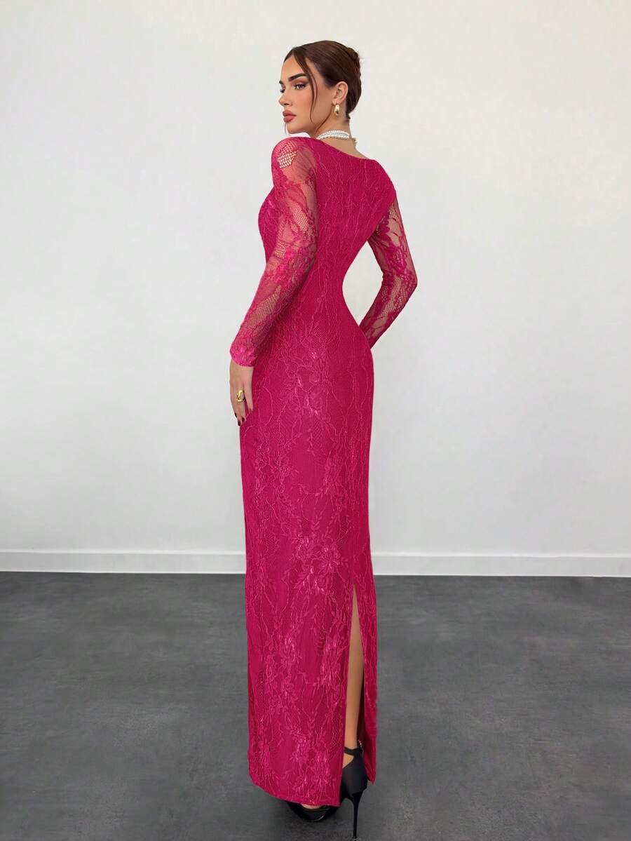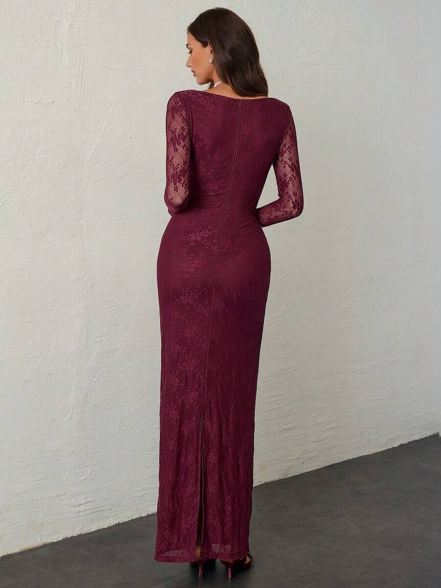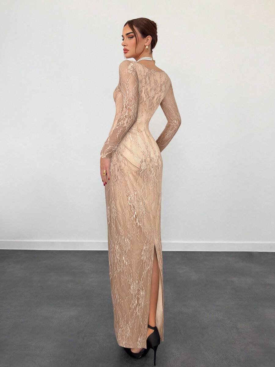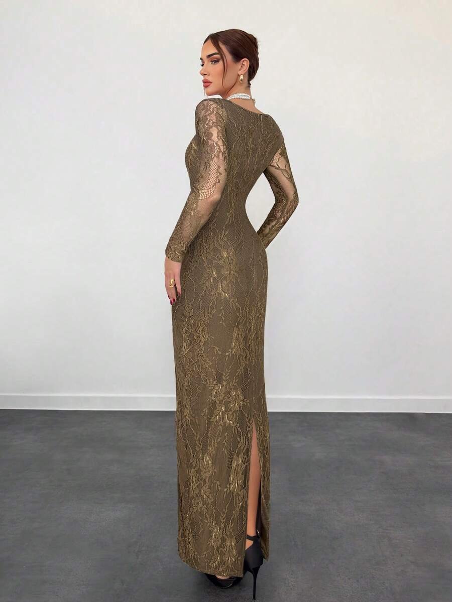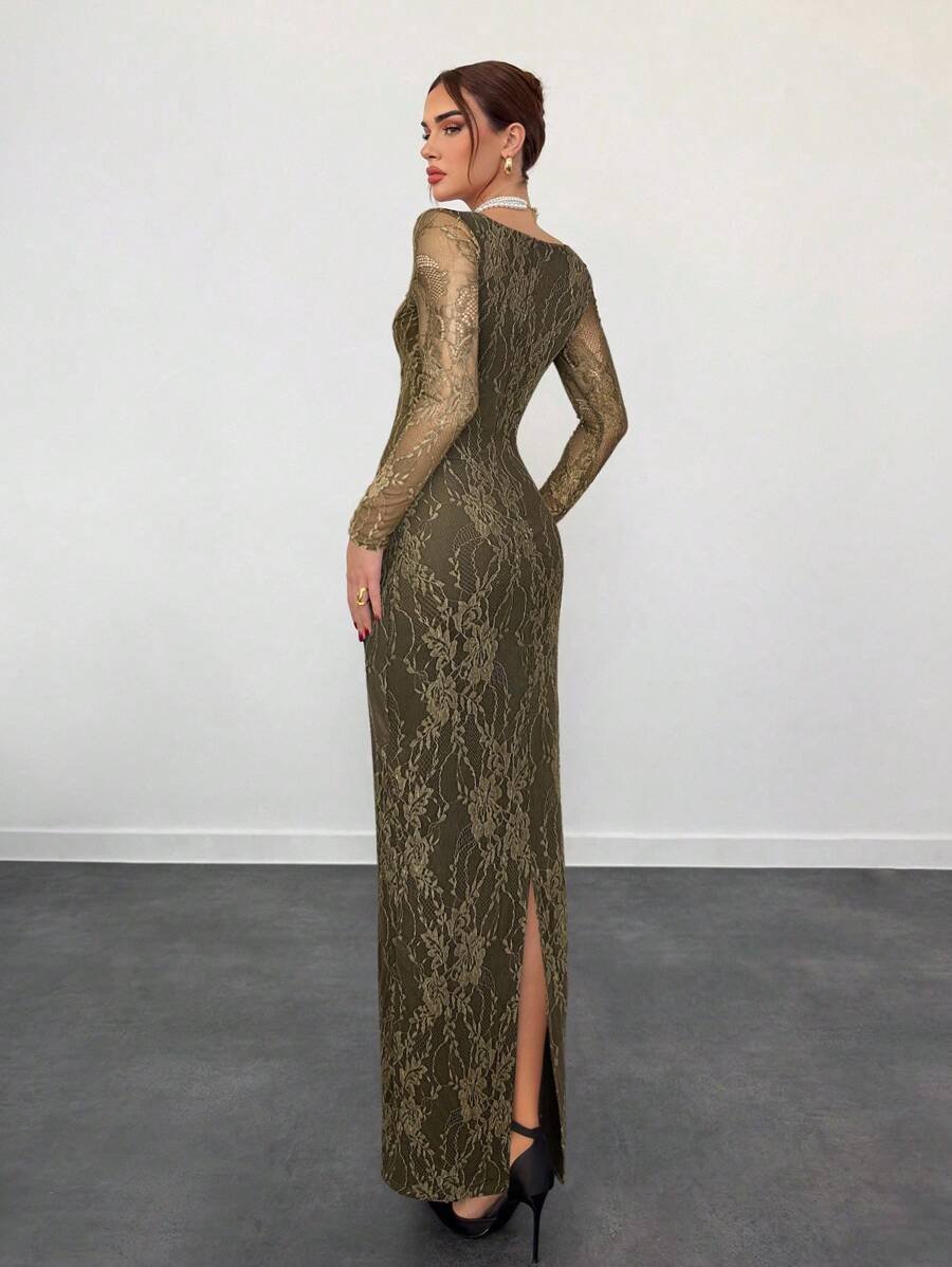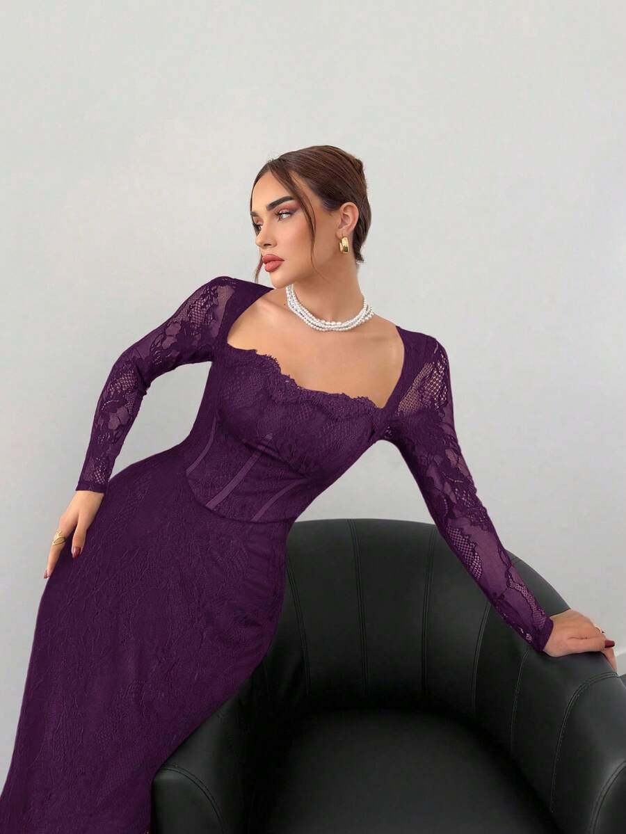 فستان سهرة طويل دانتيل بأكمام طويلة ورقبة مربعة