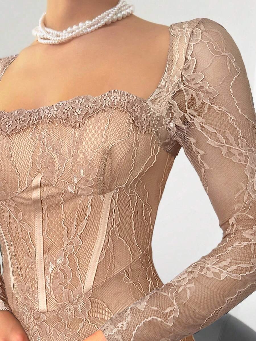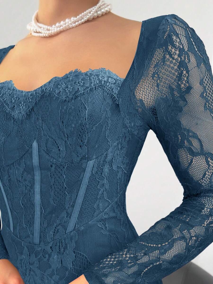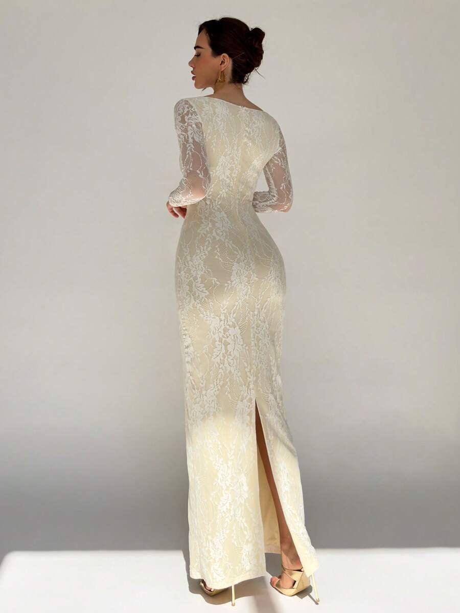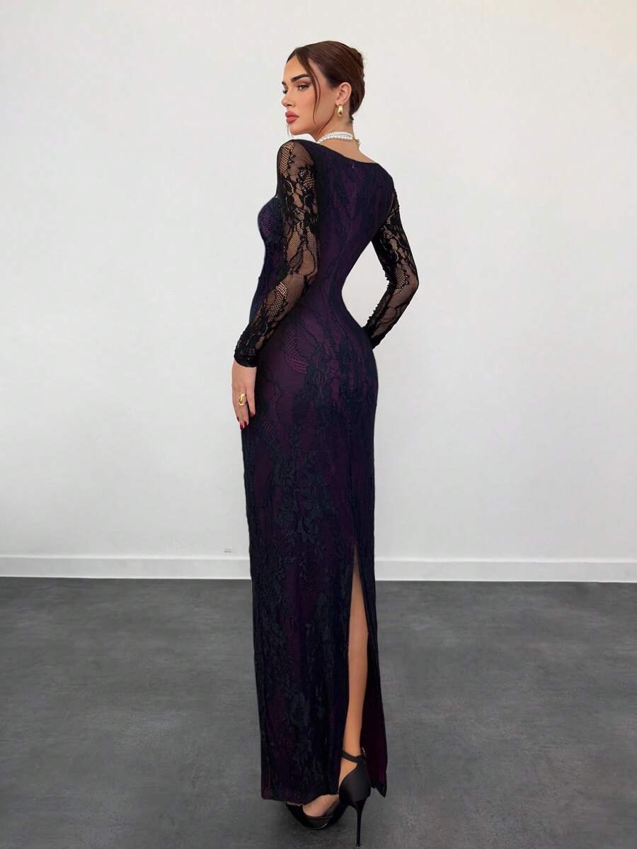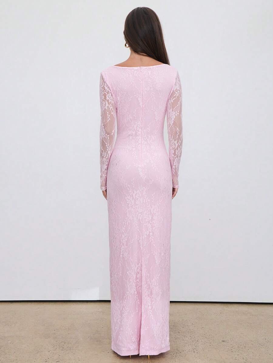 فستان سهرة طويل دانتيل بأكمام طويلة ورقبة مربعة